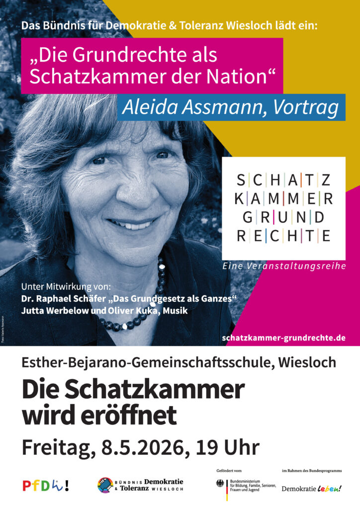 Die „Schatzkammer Grundrechte“ wird am 8. Mai 2026 in der Esther-Bejarano-Gemeinschaftsschule Wiesloch eröffnet. Den Einführungsvortrag hält die Heidelberger Kulturwissenschaftlerin Prof. Aleida Assmann zum Thema: „Die Grundrechte als Schatzkammer der Nation“.