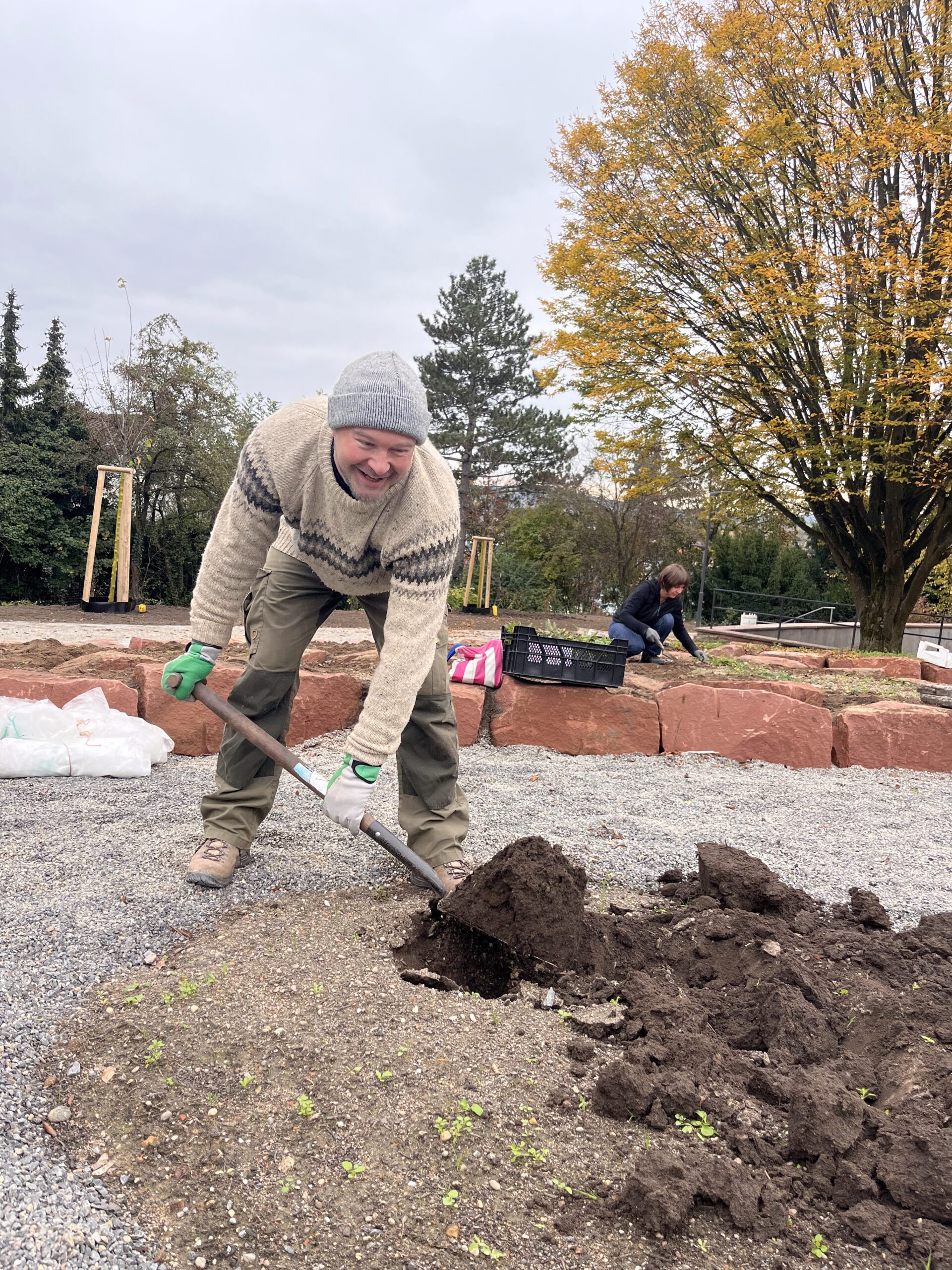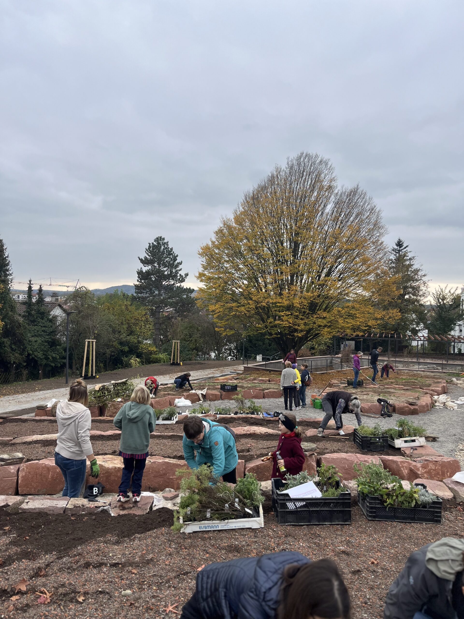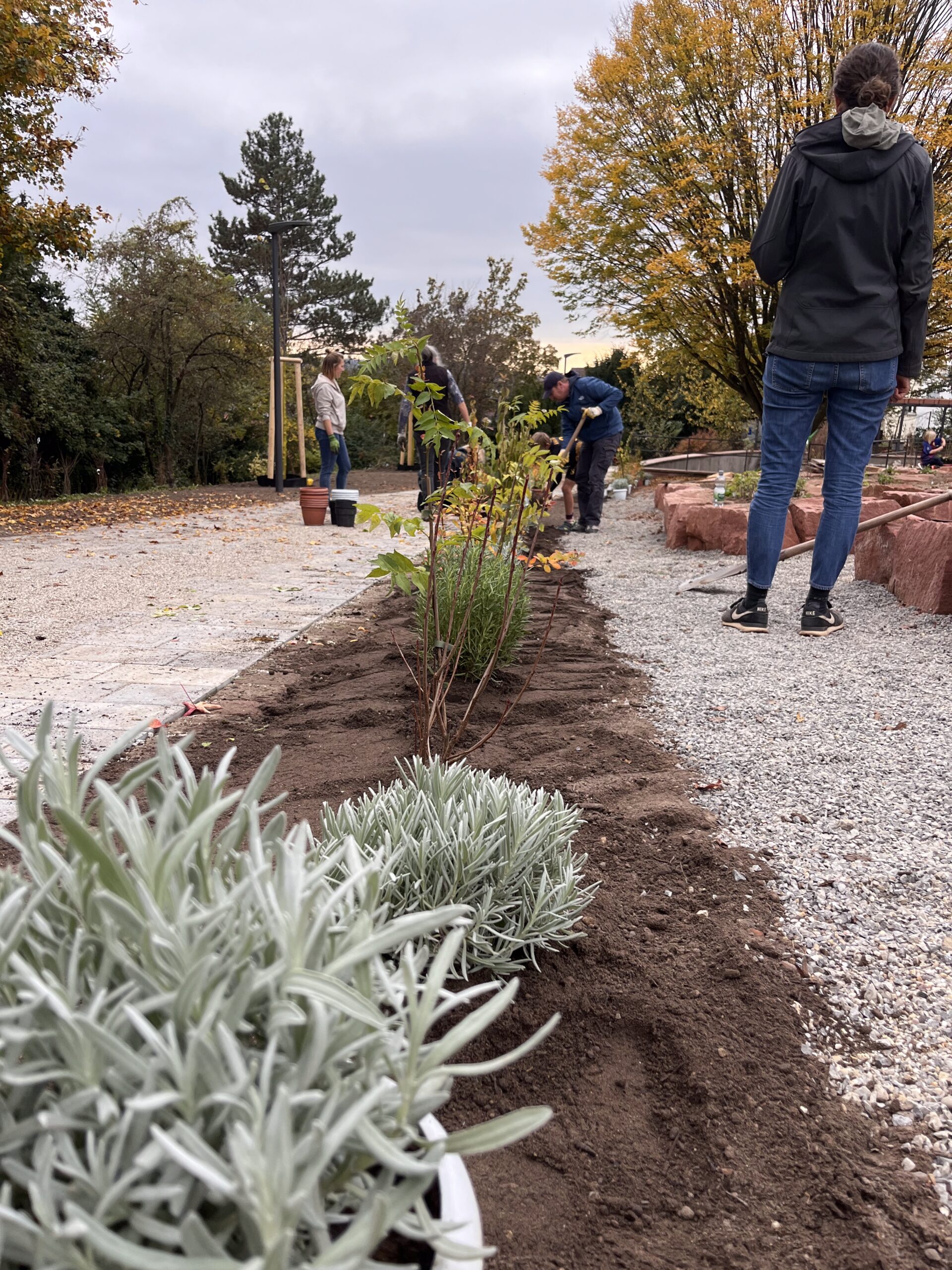 Der Garten ist noch dabei sich zu entwickeln: Im November 2024 wurden die Beete angelegt und teilweise bepflanzt. Nach weiteren Pflanzaktionen im Frühjahr 2025 ist der Garten jetzt vollständig. Damit weiterhin alles wächst und gedeiht, muss regelmäßig gegossen, gejätet und gemulcht werden – gemeinsames Gärtnern ist ausdrücklich erwünscht.